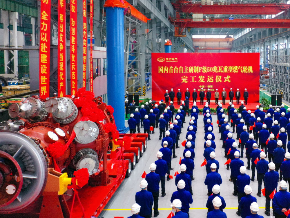 国产F级50兆瓦重型燃气轮机的完工发运仪式现场。(东方电气集团供图)